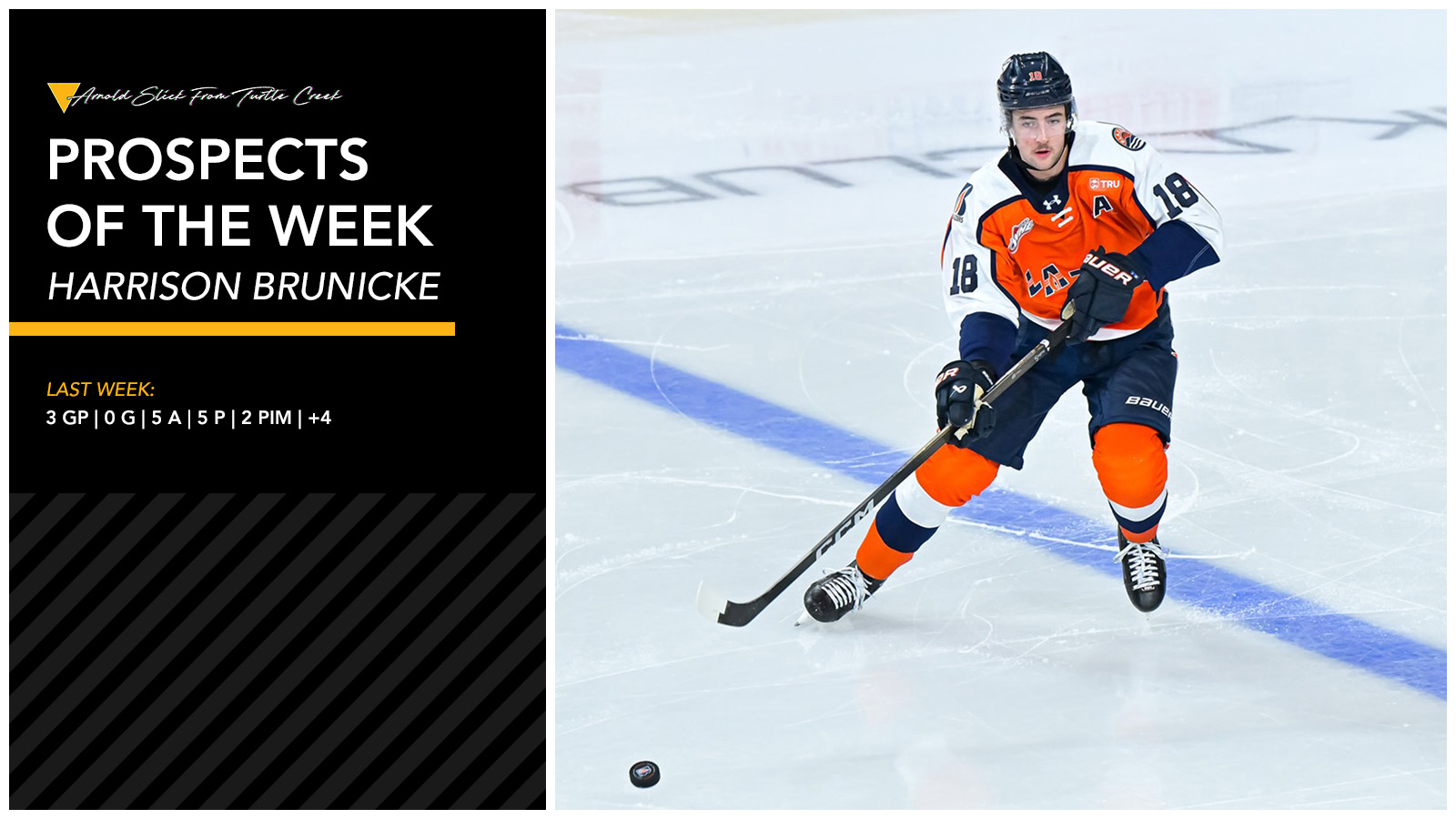 Harrison Brunicke continued to produce from the backend in the WHL with five assists in three games for the Kamloops Blazers last week. The 2024 second round pick recorded three assists–two primary and one secondary–in a 5-2 win over the Red Deer Rebels on Wednesday, added a secondary assist in a 5-2 win over the Penticton Vees on Friday, and picked up another secondary assist in a 4-3 overtime loss to the Prince George Cougars on Saturday. Brunicke boasts 12 points in eight games since rejoining Kamloops after starting the season with Pittsburgh and representing Canada at the 2026 World Junior Championship. The Blazers currently rank fifth in the Western Conference in the WHL, and the look to surprise some teams in the postseason with the addition of Brunicke on the blueline.